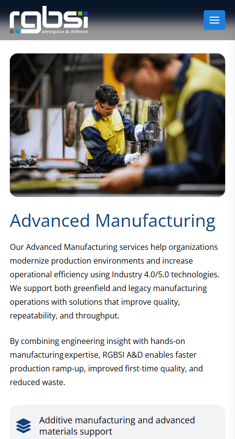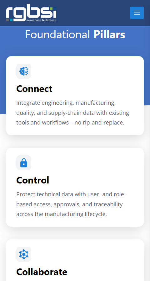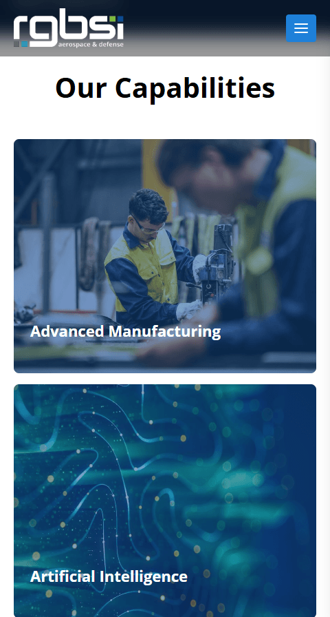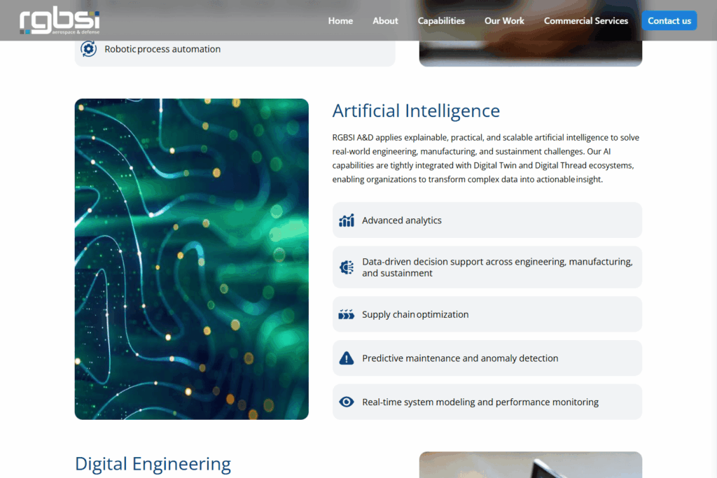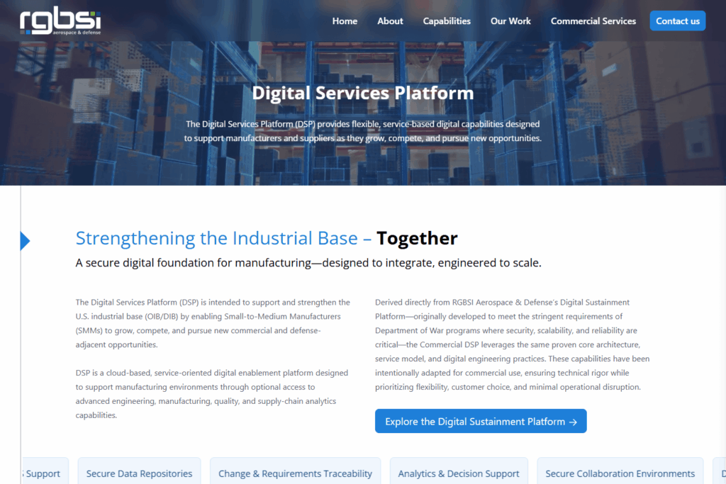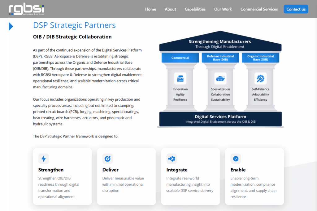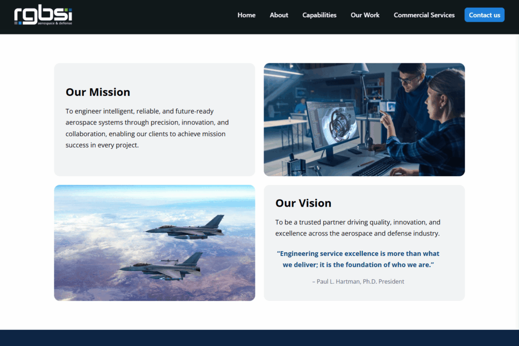 RGBSI Aerospace & Defense LLC es una empresa de ingeniería de servicio completo que apoya a clientes federales y comerciales de aeroespacial y defensa, y es una subsidiaria de RGBSI con 27 años de experiencia global. La empresa cuenta con las certificaciones ISO 9001:2015 y AS9100 Rev D, es una WOSB certificada por la SBA y mantiene procesos compatibles con DCAA/DCMA con calificación CMMC Nivel III. Sus capacidades abarcan ingeniería digital, IA, fabricación avanzada e ingeniería de sistemas basada en modelos, incluida su Plataforma de Mantenimiento Digital (DSP), certificada bajo DoDI 5000.97 para redes seguras del DoD. Con esta sólida trayectoria, RGBSI A&D necesitaba una presencia digital que coincidiera con la precisión y credibilidad de su trabajo.