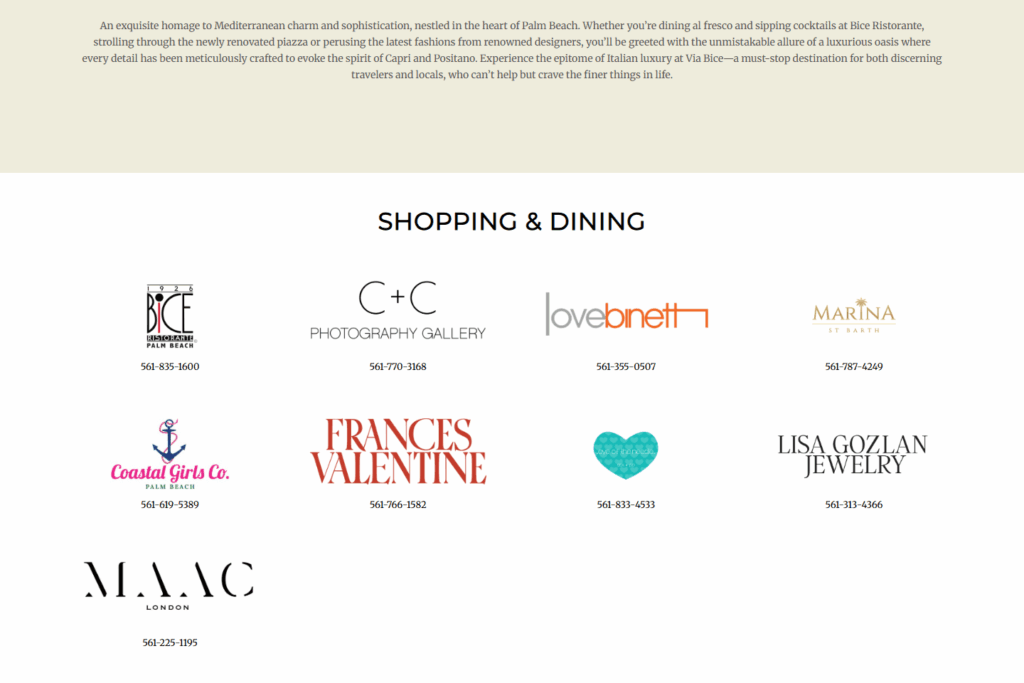 Via Bice es un destino de lujo en Palm Beach que combina moda de alta gama, restaurantes exquisitos y elegancia mediterránea. El espacio está diseñado para sentirse como una muestra de Capri o Positano, un oasis de estilo, comida y ambiente donde los visitantes no solo compran o comen, sino que experimentan. Con su mezcla de boutiques, restaurantes y diseño curado, Via Bice necesitaba una presencia digital que coincidiera con la elegancia física y atrajera tanto a los lugareños como a los visitantes.