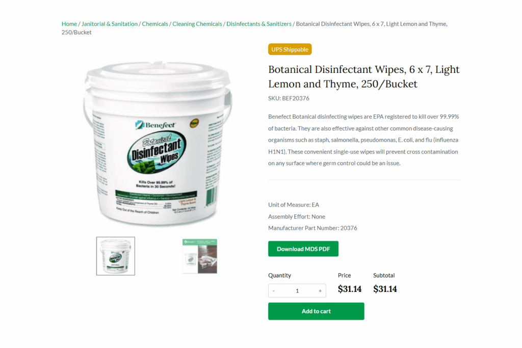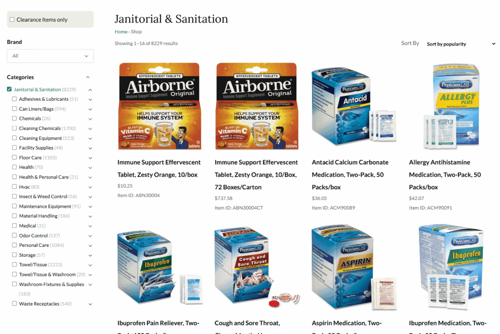 Organized the extensive inventory into clear categories—cleaning chemicals, paper & plastic, floor care, waste & recycling, personal care, and more.