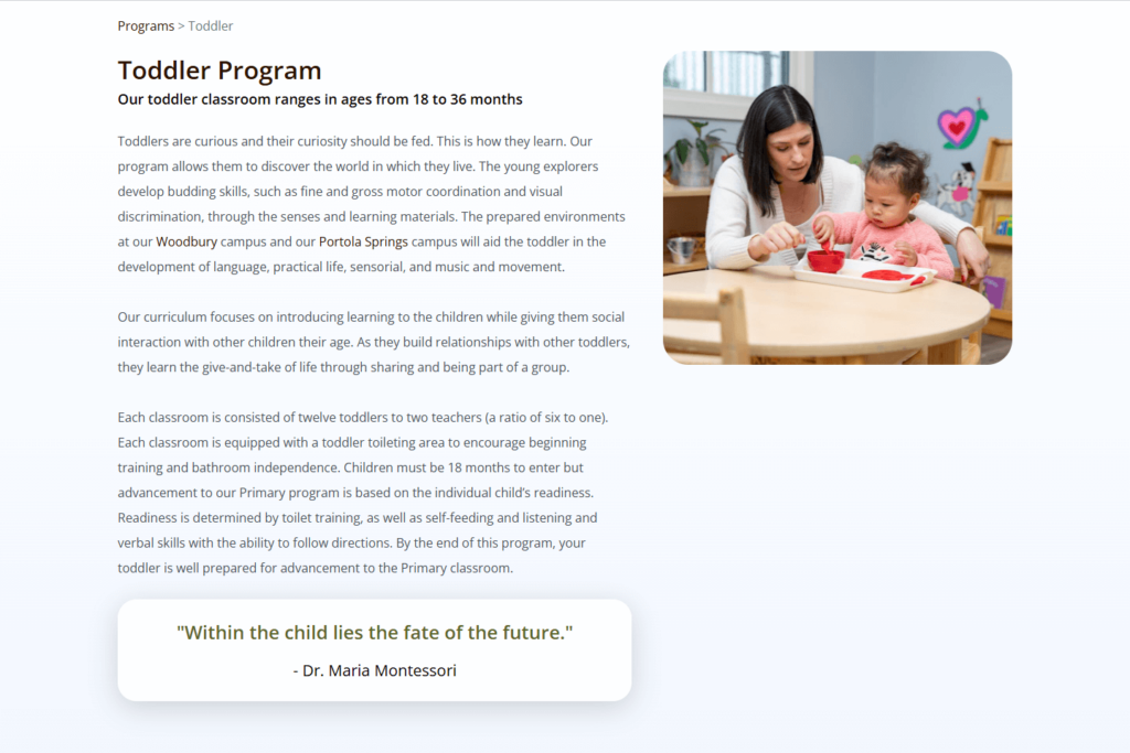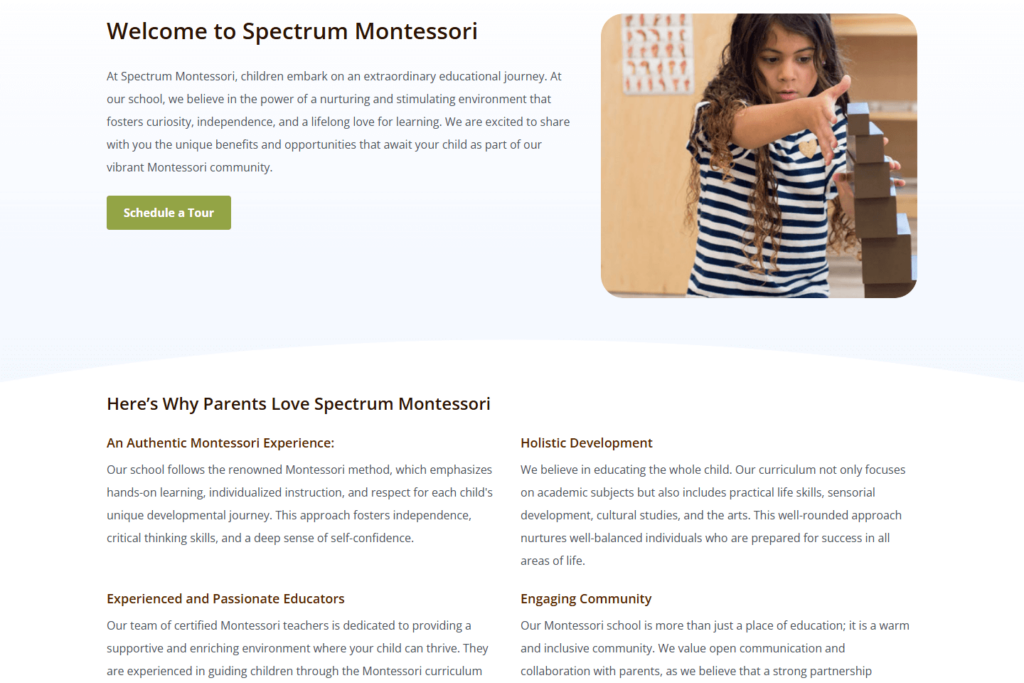 ウェブサイトのトラフィックが35%増加 SEO の改善とより魅力的なデザインにより、サイトへの訪問者が増加し、Spectrum Montessori の認知度が向上しました。